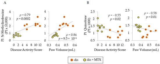 Spearman’s correlations for plasma metabolite levels in normalized peak intensity (PI) of (A) N-methylisoleucine and (B) quinolone with PV and DAS. Dis (orange; n = 8) and dis + MTX (yellow; n = 9).