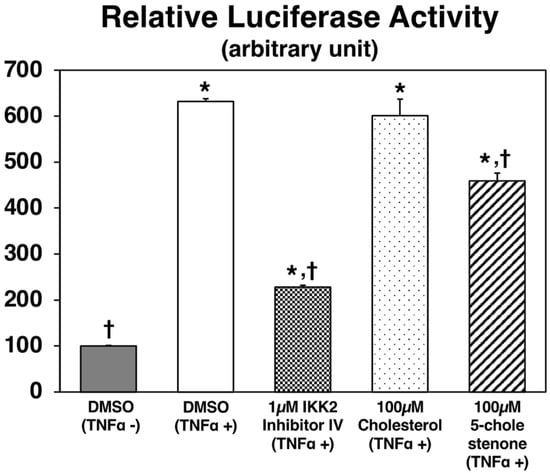 Luciferase activities in NFκB-Luc/CHO-K1 cells. Cells were treated with or without murine TNFα (10 ng/mL in DMSO), cholesterol (100 µM in DMSO), 5-cholestenone (100 µM choles-5-en-3-one in DMSO), or 1 µM IKK2 inhibitor IV. After 7 h of incubation, NFκB luciferase was detected using the ONE-StepTM Luciferase assay system. Values are expressed as the mean ± standard error (n = 3 wells). * Significant difference at p < 0.05 compared to DMSO (TNFα-) treatment. † Significant difference at p < 0.05 compared to DMSO (TNFα+) treatment.
