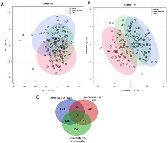 To understand how the metabolic response to major trauma changed over time, we first compared the serum metabolomes at each of our three post-injury sampling phases. Unsupervised PCA (Figure 1A) and supervised PLS-DA (Figure 1B) analysis demonstrated marked variation in the metabolomic profiles measured at the acute, intermediate and late post-injury time-points.