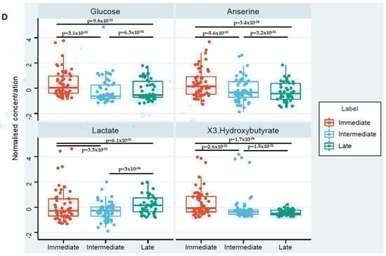 To identify the significant metabolites in each of these segments, a one-way ANOVA was performed with at p < 0.05, Fisher’s LSD corrected. Figure 1C shows the number of metabolites unique to and shared across each time segment. A one-way ANOVA revealed the most variation in metabolite levels across the different time-points was for metabolites putatively identified as, glucose, anserine and 3-hydroxybutyrate respectively. The heatmap presented in the supplementary Figure S1 summarises the changes that occurred in the levels of these metabolites across the three post-injury phases. The percentage of the model variance explained (R2), and the predictive ability (Q2) were found 86% and 58% respectively. The PLS model was found statistically significant at p < 0.01 after permutation test (supplementary Figure S2). Compared to samples acquired in the acute injury setting, significantly lower glucose levels, anserine and 3-hydroxybutyrate were detected at the intermediate and late sampling time-points (Figure 1D). Serum levels of lactate were significantly higher in the late post-injury phase when compared to the intermediate sampling time-point (Figure 1D).