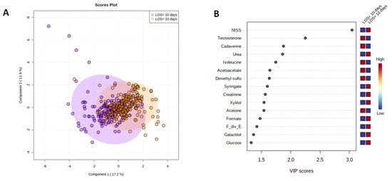 For dichotomous or binary outcomes (ICU LOS < 10 vs. ≥10 days), we used a supervised classification method called partial least-squares discriminant analysis (PLS-DA). We quantified model statistics based on the fraction of the sum of squares for the selected component (R2), which equates to the percentage of the model variance explained, and the predictive ability (Q2). A 10 fold cross-validation was performed to predict and estimate the model performance (whether models were overfitted). In addition to this we have performed a permutation test to derive probability values from the fitted models. We used variable importance in the projection scores (VIP) to prioritize metabolites and clinical features. VIP scores of more than one are considered important, and this score of a variable is calculated as a weighted sum of the squared correlations between the PLS-DA components and the original variable. For metabolomics and clinical data, we used a VIP score of more than 1.5 as a cut-off [41]. Further, we used AUC values to provide predictive aspects of the combined markers selected. For analysis, we used the Metaboanalyst version 4.0 software [40] for both model building and VIP score estimation.