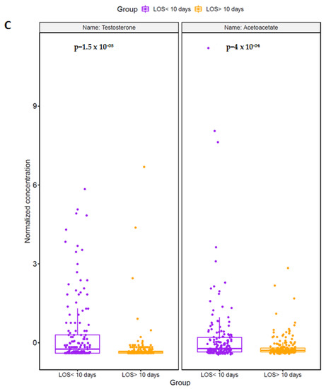 The following supporting information can be downloaded at: www.mdpi.com/article/10.3390/metabo12010029/s1, Figure S1: Heatmap of the selected metabolites across multiple patients; Figure S2: Permutation test statistics over 100 iterations across multiple segments; Figure S3: Permutation test statistics over 100 iterations with selected metabolites for ICU LOS > 10 vs. <10; Table S1: List of the clinical parameters; Table S2: List of the selected metabolite data set.