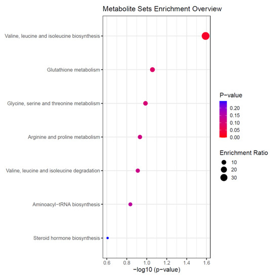 To identify the metabolic pathways associated with the selected metabolites, and thus an ICU LOS ≥ 10 days, enrichment analysis using MetaboAnalyst was performed. We found valine, leucine and isoleucine biosynthesis, glutathione metabolism, and glycine, serine and threonine metabolism were the top three pathways with a p < 0.05 (Figure 4).