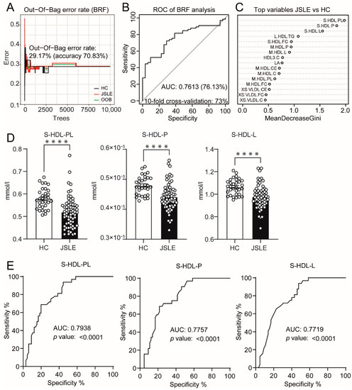 Using an in-depth nuclear magnetic resonance lipid metabolomic platform, a detailed retrospective analysis of the serum lipid profile of adolescent patients with JSLE was performed compared to age-matched HCs (Table 1 for cohort characteristics, Supplementary Table S1 for list of metabolic biomarkers). Using a balanced random forest (BRF) machine learning approach, 130 lipid metabolites were analysed—adjusting for age, sex, and race (Figure 1A–C). The BRF model distinguished JSLE patients from HCs with a 76% prediction accuracy (73% by 10-fold cross-validation) (Figure 1B), supporting a distinctive dyslipidaemic profile in adolescent patients with JSLE. The variables contributing most to the model were small (S)-HDL subsets, including total lipid (L) and phospholipid (PL) content, and S-HDL particle concentration (P) followed by medium HDL subsets, linoleic acid and very small (XS)-VLDL subsets (Figure 1C). These results were confirmed when the expression of the top three individual metabolites differentiating patients from HCs (mean decrease in Gini>1.5; S-HDL-PL, S-HDL-P, and S-HDL-L) were assessed by conventional statistical analysis (Figure 1D, Supplementary Figure S1A for other metabolites). Notably, receiver operator characteristic (ROC) analysis of these metabolites showed an AUC of 0.796, 0.779, and 0.774 respectively (Figure 1E), suggesting that atherogenic dyslipidaemia in JSLE may be compartmentalised to circulating S-HDL lipid levels, as opposed to the entire lipidome as shown by the BRF model. Importantly, these HDL metabolites were not significantly associated with the levels of circulating anti-ApoA1 antibodies (Supplementary Table S2) and there was no significant difference in ApoA1 expression or the HDL-C:ApoA1 ratio between patients with JSLE and HCs (Supplementary Figure S1B), suggesting that global and HDL-associated ApoA1 expression were not altered in JSLE.