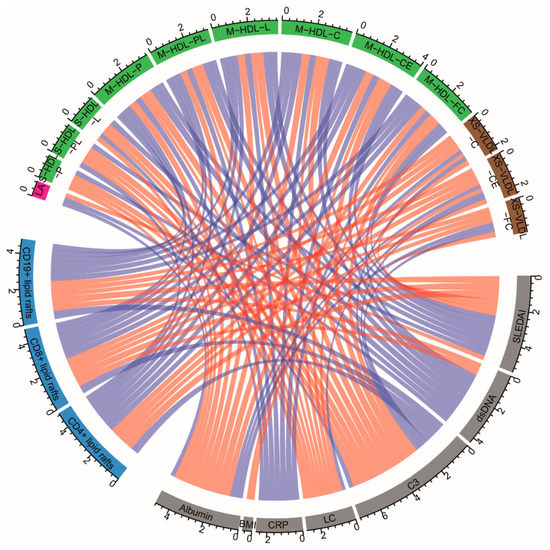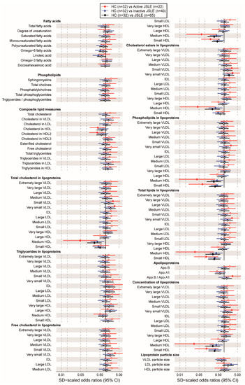 Serum from JSLE patients and HCs were analysied using the Nightingale nuclear magnetic resonance metabolomics platform (https://nightingalehealth.com/, Accessed on 18 February 2020) which includes over 130 blood lipid metabolic biomarkers (Supplementary Table S1). Included in the platform is the simultaneous measurement of routine lipid measures and in-depth lipoprotein measurements, such as particle size and content.