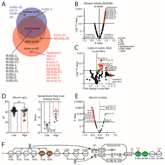 Atherogenic lipoproteins correlate positively with markers of JSLE disease activity and are associated with markers of liver damage. (A) Venn diagram (http://www.biovenn.nl/, Accessed on 20 June 2020) displaying the proportional overlap of statistically significantly altered metabolites from (A) that overlap between the different group comparisons. Metabolites that are both top variables in the BRF model and are significantly altered by logistic regression analysis are underlined. Abbreviations: Apo, apolipoprotein; VLDL, very low-density lipoprotein; LDL, low density lipoprotein; HDL, high density lipoprotein; C, cholesterol; CE, cholesterol ester; D, diameter; FA, fatty acid; FC, free cholesterol; L, total lipids; P, particles; PL, phospholipids; FAw6, omega-6 fatty acid; LA, linoleic acid. Volcano plot showing (B) the correlation (r-value, Pearson’s) of systemic lupus erythematosus disease activity index (SLEDAI) with serum lipid metabolomic measures in JSLE patients (n = 65) and (C) the fold change of serum lipids in JSLE patients experiencing a clinical flare (previously inactive patients with an increase in SLEDAI by 4 points or more [21], mean increase of 7.2 points)) compared to matched patients pre-flare (n = 5). Log10 p values are displayed. Horizontal line represents adjusted p value threshold following 10% false discovery rate adjustment for multiple comparisons. Coloured dots represent different metabolomic groups. Important metabolites from the Venn diagram (B) are labelled. (D) Liver function measurements including albumin and non-alcoholic fatty liver disease score in clinically active (n = 22 and 7 respectively) versus clinically inactive disease (+/− serological activity) (n = 43 and 8 respectively) JSLE patients. Mean, t-test. *** p = <0.0001, * p < 0.05 (E) Volcano plot showing the correlation (r-value, Pearson’s) of albumin with serum lipid metabolomic measures in JSLE patients (n = 65). Important metabolites from the Venn diagram (B) are labelled. Log10 p values are displayed. Horizontal line represents adjusted p value threshold following 10% false discovery rate adjustment for multiple comparisons. Coloured dots represent different metabolomic groups as per (B–C). (F) Schematic representation of known lipoprotein metabolic processes including peripheral cell lipid influx (via CD36 and LDLR) and efflux (via ABCA1), adapted from Frishberg, A. et al. [26]. Metabolites are highlighted that are significantly altered in all JSLE patients (small/medium-HDL, S/M-HDL) and JSLE patients with clinically active disease (small/very small-VLDL, S/XS-VLDL) compared to HCs as informed and validated by analysis from Figure 1 and Figure 2. Abbreviations: ABCA1, ATP Binding Cassette Transporter A1; LDLR, LDL receptor; SM, sphingomyelin; PG, phosphoglycerides; PC, phosphatidylcholine.