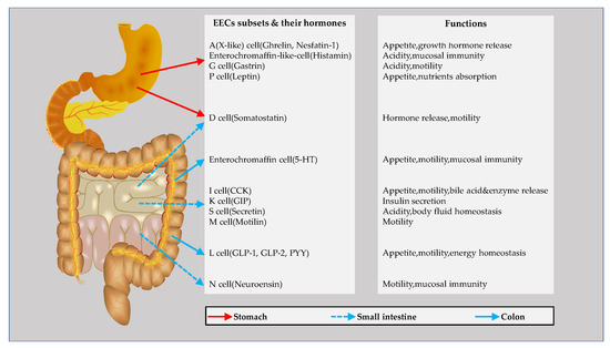 Schematic illustration of enteroendocrine cell (EEC) subsets in the gastrointestinal tract, as well as a demonstration of the major secretary hormones and their functions. 5-HT, 5-hydroxytryptamine; CCK, cholecystokinin; GIP, glucose-dependent insulinotropic peptide; GLP-1, glucagon-like peptide-1; GLP-2, glucagon-like peptide-2; PYY, peptide YY.