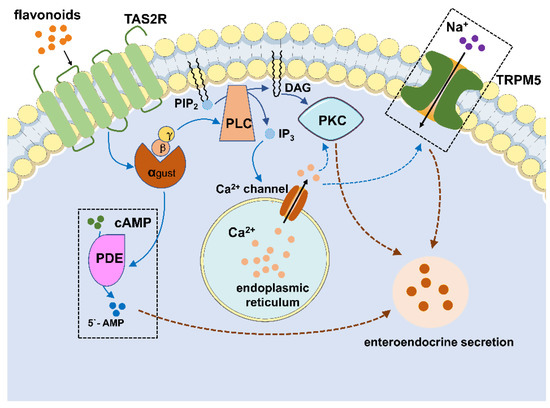 Potential pathways of enteroendocrine hormone secretion induced by flavonoids. The combination of ligands and TAS2R stimulates a signalling cascade, which comprises the G-protein gustducin detaching from the Gα and Gβγ subunits, activating phospholipase C β2 (PLCβ2) and producing diacylglycerol (DAG) and inositol 1, 4, 5-trisphophate (IP3), as well as opening transient receptor potential ion channel M5 (TRPM5), releasing intracellular Ca2+ ([Ca2+]i), Na+ influx, cellular depolarisation and the secretion of neurotransmitters. DAG and [Ca2+]i also activate the protein kinase C (PKC) pathway. Additionally, the increased level of the intracellular Gα subunit triggers phosphodiesterase.