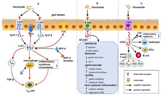(A) Flavonoids regulate IBD by the DPP-4/GLPs pathway: (1) protecting the intestinal barrier, (2) modulating Treg and intraepithelial lymphocytes (IELs) by managing their differentiation and functions and (3) adjusting the function of macrophages and dendritic cells. (B) Flavonoids regulate IBD by the ghrelin pathway: (1) increased food intake, (2) increase in growth hormone activity, (3) cardiovascular effects, (4) increased motility and (5) decreased local and systemic inflammation. (C) Flavonoids regulate IBD by the cholecystokinin (CCK) pathway: (1) decreasing the mucosal production of proinflammatory cytokines and protecting the intestinal barrier, (2) attenuating leukocyte migration and inhibiting dendritic cells (DCs) activation and (3) regulating T cells and B cells.