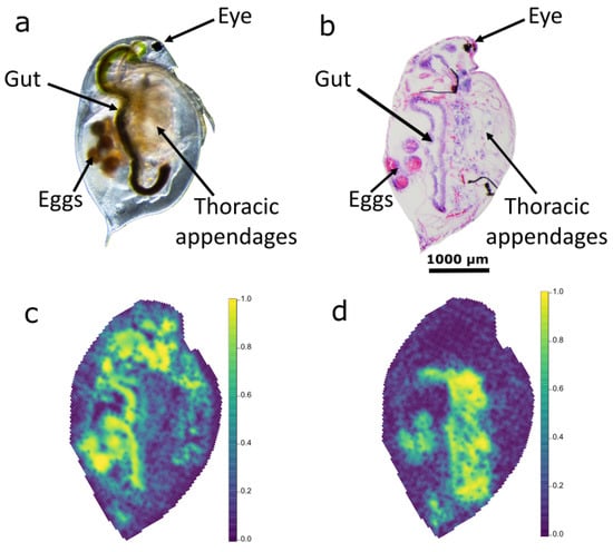 Images of the model organism Daphnia magna; (a) labelled microscope image, (b) labelled H&E-stained cryosection that was generated using our optimized tissue preparation workflow, (c,d) ion images showing the distribution of phosphatidylcholine (m/z = 756.5521) and triacylglyceride (m/z = 835.6229), respectively. The color bars show the relative intensity of the lipid in the ion images.