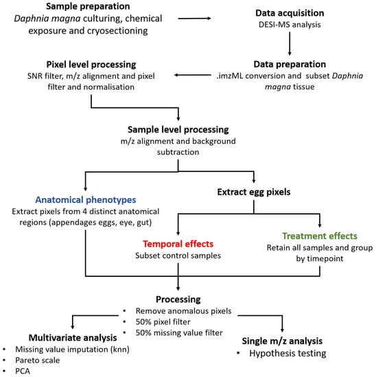 Our final signal processing workflow is split into four distinct parts, which we describe here with a rationale for each step. First, we extracted only the pixels that were pertaining to the D. magna tissue within the rectangular analysis area, hence removing many background pixels (Figure S4). This was important for the subsequent signal processing thresholds which were based on the assumption that all the data were from biological sources to ensure that each tissue section was subject to the same effective filtering (e.g., if 1000 background pixels were included when processing 1000 biological pixels, this would reduce the effective pixel filter by half, see below). We then processed the collection of mass spectra from the pixels within the individual tissue sections using: (i) a signal-noise ratio (SNR) filter to remove low intensity noise features with SNR < 3 based on the well-established LOD in analytical chemistry [39], (ii) m/z alignment within a 25 ppm tolerance that was derived from monitoring the m/z drift throughout the tissue section, (iii) a pixel filter to remove non-reproducible noise features that occurred in <5% of all the pixels in the tissue section, and (iv) root mean squared (RMS) normalization. Next, we aligned the spectra across all pixels in the study using a slightly less strict 35 ppm tolerance to account for the larger m/z drift over the multi-day study, and removed the intense background ions that were detected in the blank DESI slide. These processing steps achieved a reduction in the file sizes (per tissue section) from an initial 105 GB of raw study data to a more manageable ca. 8.5 GB, from which we were able to map the ion distributions for many hundreds of ions, with representative ion images shown in Figure 1c,d for m/z 756.5521 and 861.6503, respectively. Finally, the data were processed to address the specific biological objectives by (i) extracting data from the specific D. magna regions-of-interest (ROIs), (ii) removing anomalous pixels, and (iii) applying strict pixel and missing value filters, yielding data matrices for single feature statistical analysis and, following missing value imputation and pareto scaling, for principal component analysis (PCA)—as discussed in Section 2.2, Section 2.3 and Section 2.4. Due to its relative complexity with multiple steps that were optimized during this study, the entire workflow is summarized in Figure 2 for the convenience of the reader.