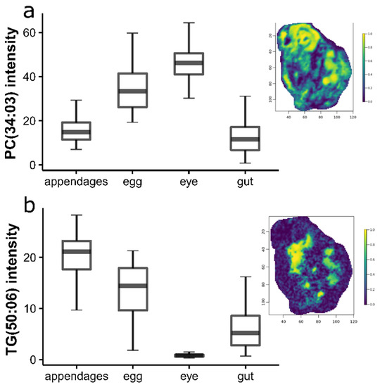 The lipid classes that were predominantly driving the separation of the tissue types in this unsupervised multivariate analysis were the phosphatidylcholines and triacylglycerides. Boxplots and the corresponding ion images of two representative lipid species, one from each lipid class—specifically PC(34:03) and TG(50:06) where we used the standard naming format for lipids describing the number of carbon atoms and double bonds—are shown in Figure 4a,b, respectively, indicating their localization within D. magna. These results revealed the accumulation of phosphatidylcholines in the developing eggs and eye, and triacylglycerides that were predominantly stored in the appendages and eggs.