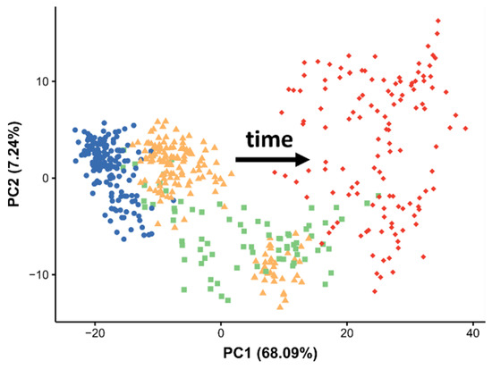 PCA scores plot from analysis of the DESI-MS dataset of unexposed Daphnia magna eggs across the seventh adult instar—specifically 8 (blue circles), 24 (yellow triangles), 48 (green squares), and 72 h (red diamonds) after the sixth brood. Each point relates to a single pixel from a DESI-MS ion image of D. magna egg.