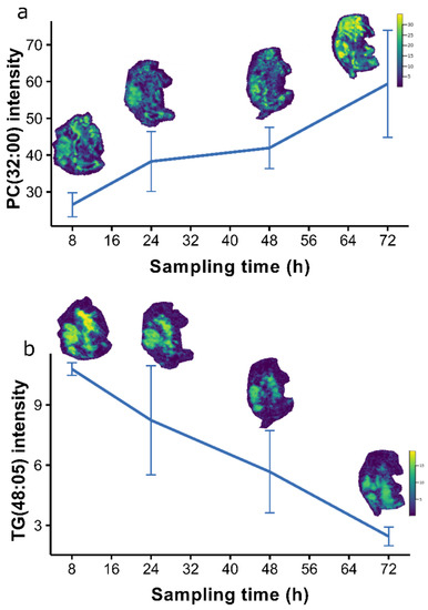 Line graphs showing the differences in the abundance of a representative phosphatidylcholine and triacylglyceride; (a) PC(32:00) at m/z = 756.5521, and (b) TG(48:05) at m/z 835.6229, in Daphnia magna eggs across the seventh adult instar—specifically 8, 24, 48, and 72 h after the sixth brood. The error bars represent a 95% confidence interval. The ion images are overlaid on each plot to visualize the distribution of each lipid across the whole animal over time. The colour scale indicates the relative abundance of each lipid.