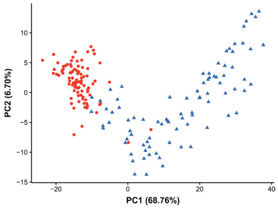 The PCA scores plot from analysis of the DESI-MS dataset of the control Daphnia magna eggs (blue triangles) relative to those that were exposed to 5 mg/kg bisphenol-A for 48 h (red circles). The exposure period started immediately after the sixth adult brood. Each point relates to a single pixel from a DESI-MS ion image of a D. magna egg.
