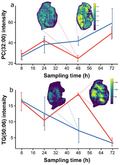 Line graphs showing the differences in abundance of a representative phosphatidylcholine and triacylglyceride; (a) PC(32:00) at m/z = 756.5521, and (b) TG(50:06) at m/z 861.6503, in control (blue) and bisphenol-A exposed (red) Daphnia magna eggs across the seventh adult instar—specifically 8, 24, 48, and 72 h after the sixth brood. The error bars represent a 95% confidence interval. The ion images are overlaid on each plot to visualize the distribution of each lipid across the whole animal as a function of BPA exposure 48 h into the instar. The colour scale indicates the relative abundance of each lipid.