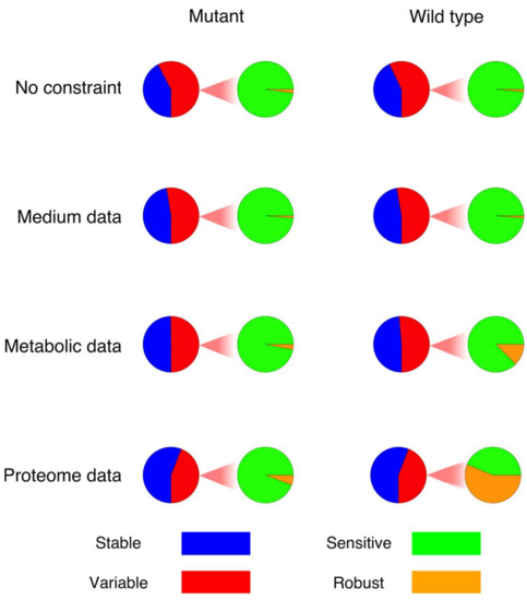Figure 1 shows the fraction of variable reactions that are sensitive or robust in each model, respectively. The integration of constraints results in an increase in the robust fraction, pointing on a significantly decreasing sensitivity interval. While the extent of this effect is very different between the wildtype and the mutant, the overall pattern seems to be conserved.