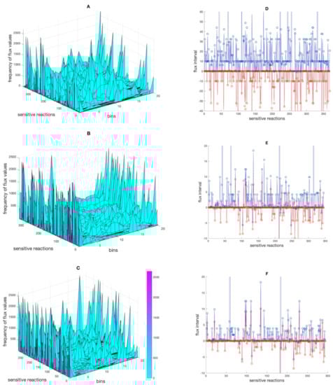 The distribution of alternative flux values across the flux intervals. Panel (A–C) show the frequency of flux values of sensitive reactions divided into 20 bins in the mt + med, mt + med + met and mt + med + met + pro models, respectively. Panel (D–F) show the intervasl in the respective models in which sensitive reactions responded to perturbations (red and blue lines, indicating lowest and highest flux values, respectively), and the interval given by FVA, indicated by red dots (lower bounds) and blue dots (upper bounds). For the sake of clarity, a few extreme points in panel (D–F) are excluded.