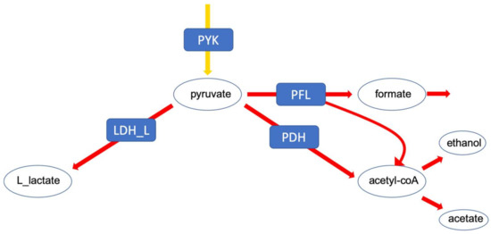 First, we investigated the branching of fluxes at the level of pyruvate. In lactic acid bacteria, pyruvate can be converted to either lactate which corresponds to homolactic fermentation or to mixed acids, comprising ethanol, formate and acetate, referred to as mixed acid fermentation. This particular branching point is highly relevant for biotechnological applications (Figure 3).