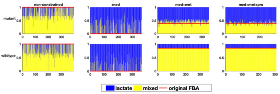 However, in the model of the mutant, even the integration of the metabolic flux data still allows qualitative differences in the flux distributions (Figure 4). In this case, in the original FBA of the mutant model, slightly more than 50% of the carbon flux goes towards lactate production, consistent with the experimental observations. However, a highly variable fermentation pattern was observed in the solution space of the FBA results using the perturbation approach, ranging from almost homolactic fermentation to mixed acid fermentation with less than 50 percent lactate formation. The integration of proteome data lessens this variability, but does not completely eliminate it.