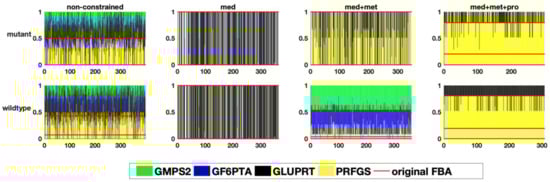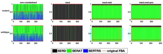 In a second example, the flux distribution at a branching point in serine metabolism is evaluated (Figure 5). This branching point can lead both to amino acid metabolism, tRNA loading, as well as central metabolism. After integrating the medium composition, in both models, a very large fraction of the flux is predicted to be channelled towards the serine O-acetyltransferase reaction (Figure 6). However, the addition of experimental metabolic flux data results in a redirection of the flux towards the other two reactions, namely serine dehydrogenase and seryl-tRNA synthetase. Although we did not explicitly include tRNA loading in our models, it should be mentioned that there have been recent efforts to include this process into genome-scale models, which further improves the inclusion of expression data [23,24,25,26,27]. In the original FBA of the fully constrained mutant model, around 95% of the flux is channelled through serine dehydrogenase. This value can slightly vary (less than 1%) in solution space (Figure 6), however, to a much smaller degree compared to the above described flux distribution at the pyruvate branching point. It is important to note that this small variation does not exist in the wildtype model, supporting once again the suggestion of a smaller solution space in the wildtype model.
