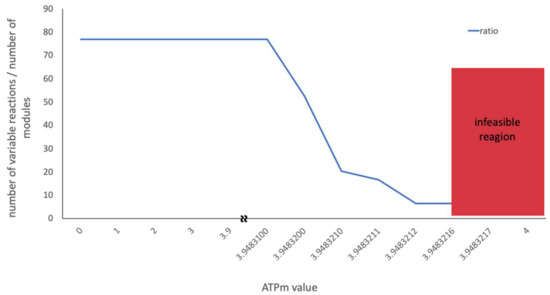 Flux scan of the ATPm value over the feasible region of the wildtype model. The blue line shows the ratio between the number of variable reactions and the number of modules generated by CoPE-FBA.