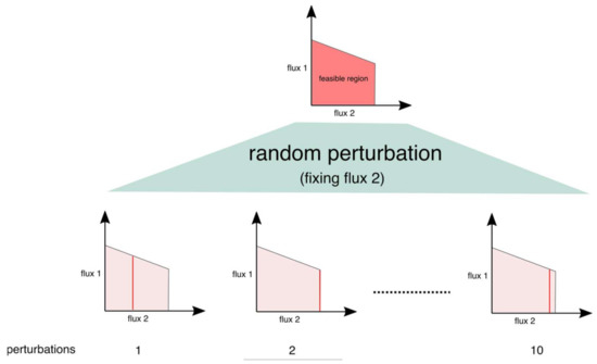 where f is the objective function vector and vmax and vmin are the vectors of maximum and minimum allowable flux values, respectively, for each reaction. Using this characteristic of constraint-based models, the perturbation procedure we proposed is based on the idea that a change in the flux value of a reaction would result in a different combination of fluxes in the network, as shown in the Figure 10, in the example of two flux combinations: