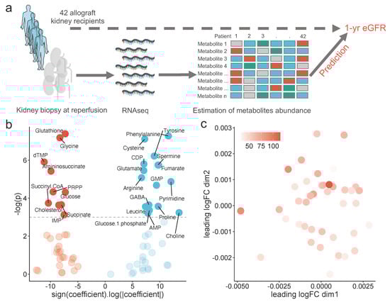 Global description of the study: (a) schematic representation of the study design, (b) volcano-plot showing the signed logarithm of the absolute ß coefficient extracting from a robust linear model using one-year eGFR as the dependent variable, and its associated p-value, for each estimated metabolite abundance, and (c) scatter plot showing the multidimensional scaling of the estimated metabolomics, colored by the one-year eGFR.