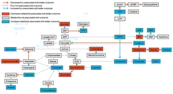 Comprehensive map linking estimation of fluxome and metabolites’ abundance with one-year eGFR. In blue are any positive associations between the metabolites’ estimated abundance or estimated reaction flux with one-year eGFR while in red are negative associations. Non-significant associations are shown in grey.