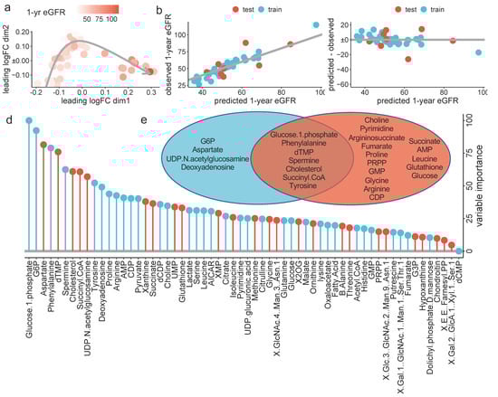 ML-based prediction of the one-year eGFR: (a) Multidimensional reduction plot showing the similarity of samples and colored by one-year eGFR, (b) scatter plot showing the observed (y-axis) predicted (x-axis) one-year eGFR, in the test (red) and training (blue) datasets. The grey line highlights the perfect relation, (c) Scatter plot showing the residuals for each predicted value, in the test (red) and training (blue) datasets. (d) Variable importance in the RF model for one-year eGFR prediction. Values are normalized to the most important variable, which was set to 100, and colored in blue if the variable is associated with a higher one-year eGFR and in red if associated with a lower one-year eGFR and (e) Venn diagram reporting the logical relation between the top 11 variable used in the RF model (blue) and the variables significantly associated with the one-year eGFR identified via robust linear regression (red), after exclusion of correlated variables (i.e., glutamate, cysteine, IMP and GABA).