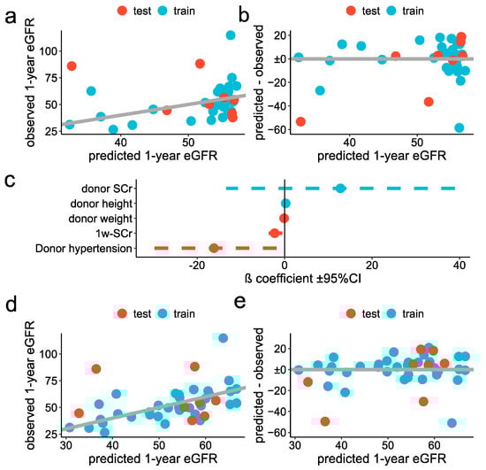 Classic statistical approach for prediction of the one-year eGFR: (a,b) Simple model: scatter plot showing the observed (y-axis) predicted (x-axis) one-year eGFR, in the test (red) and training (blue) datasets (a), scatter plot showing the residuals for each predicted value, in the test (red) and training (blue) datasets (b). (c–e) stepwise regression: forest plot showing the ß coefficient ±95% confidence interval of each variable selected in the optimal model (d), scatter plot showing the observed (y-axis) predicted (x-axis) one-year eGFR, in the test (red) and training (blue) datasets and (e) scatter plot showing the residuals for each predicted one-year eGFR, in the test (red) and training (blue) datasets.