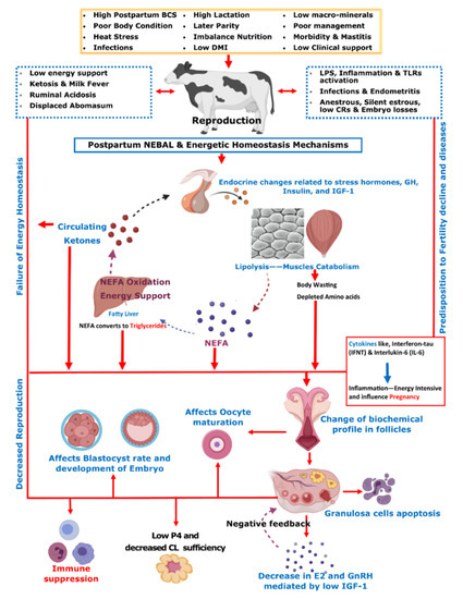 On the basis of contents discussed in the manuscript, this summary chart illustrates post-parturient metabolic alterations resulting in the decline in reproductive performance in dairy cows. The postpartum dairy cow is over-stressed due to parturition labor, lactation demands, possible exposure to heat stress, reduced dry matter intake (DMI), uterine involution, and initiation of the reproductive cycle. Due to these problems, post-parturient dairy cows usually suffer from a negative energy balance (NEBAL). NEBAL leads to endocrine and metabolic alterations initiated by low insulin, high glucose consumption, decreased insulin growth factor (IGF-1), and high growth hormone (GH) activity, leading to high non-esterified fatty acid (NEFA) response. NEFA is oxidized in the liver for energy support, leading to ketosis, and ultimately results in the development of fatty liver due to the accumulation of triglycerides (TGs). A higher prepartum body condition score (BCS) is determined as a predisposing factor for extensive mobilization of body fat reserves in the form of NEFA. Fat mobilization and protein metabolism lead to the depletion of the most required fatty acids and amino acids for reproduction and body well-being. These changes are the primary cause of secondary metabolic diseases such as hypocalcemia, ruminal acidosis, and displaced abomasum. Furthermore, they ultimately cause changes in the biochemical profile of the ovarian follicles, contained oocyte, developing embryo, corpus luteum (CL), and uterus, which ultimately result in low conception rates (CRs), whereas they also trigger endocrine changes at the pituitary–hypothalamus-ovary axis, including changes in estrogen (E2), gonadotrophins (GnRH), luteinizing hormone (LH), and progesterone (P4). Additionally, these aforementioned changes also influence the immune system of postpartum dairy cows through activation of LPS, cytokines, and Toll-like receptors (TLRs). These phenomena predispose the cows to infections and inflammatory conditions and thus contribute to the decline in CRs.