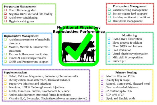 This summary chart encompasses nutritional mitigation and postpartum reproductive management support strategies. Postpartum management should be based upon the advice of dairy extension workers and/or veterinarians, with special care for appropriate feeding practices. (Abbreviations: DCAD, dietary cation–anion difference; DMI, dry matter intake; BWT, body weight; UFA, unsaturated fatty acid; PUFA, poly-unsaturated fatty acid; CP, crude protein; RDP, rumen-degradable protein; inj., injection; rbST, generic somatotropin; AI, artificial insemination; GnRH, gonadotrophin.) This figure is based upon the mitigation charts of our previous studies [9,187] and the recommendations given in this study.