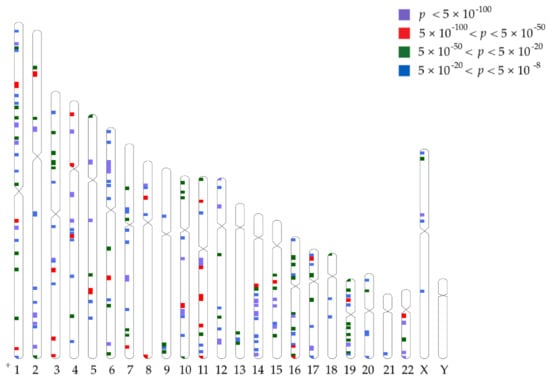 - MacArthur, J.; Bowler, E.; Cerezo, M.; Gil, L.; Hall, P.; Hastings, E.; Junkins, H.; McMahon, A.; Milano, A.; Morales, J.; et al. The new NHGRI-EBI Catalog of published genome-wide association studies (GWAS Catalog). Nucleic Acids Res. 2017, 45, D896–D901. [Google Scholar] [CrossRef]