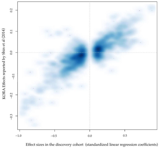 We compared the results obtained from our GWAS with the summary statistics of the GWAS of the plasma levels of 177 overlapping metabolites from the previously published results on the KORA cohort [12] which are publicly accessible (http://metabolomics.helmholtz-muenchen.de/gwa/si/, accessed on 15 September 2021). Due to the different genetic imputation panels (HRC vs. HapMap2), only a subset of about 2 million genetic markers was available in both datasets. We selected one marker per 92 regions that was associated in our initial discovery GWAS, based on strength of association in the discovery cohort and availability in KORA (Table S7). Nominally significant replication was obtained for 87 out of 102 of the attempted regions, of which 60 remained significant after Bonferroni correction for multiple testing. Beyond statistical significance, the directions of the genetic effects were remarkably consistent in both datasets, for all the other SNPs that were significantly associated with metabolites in the discovery cohort (Figure 2). The meta-analysis of these 201 metabolites identified two additional unique genomic regions for which we report new associations with metabolite levels (Table S8), bringing the total of newly associated metabolically active loci to 74.