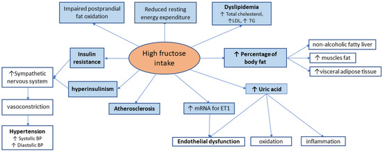 In humans, the consequences of high fructose consumption have similar effects to those seen in animal models, leading to non-alcoholic fatty liver (NAFLD) disease, dyslipidemia, insulin resistance, reduced resting energy expenditure, and impaired postprandial fat oxidation [25]; this is summarized in Figure 1. Furthermore, fructose is the only carbohydrate that generates uric acid during its metabolization. Uric acid levels rise a few minutes after high-fructose meals, with circulatory levels remaining high, even in the late postprandial phase [26]. This is the consequence of hepatic phosphorylation of large quantities of fructose, which produces adenosine triphosphate depletion, thus stimulating the production of uric acid [27]. Uric acid induces inflammation, oxidation, and endothelial damage, aggravating atherosclerotic lesions in CVD patients. Decreased levels of uric acid through appropriate therapy lead to improvement in metabolic syndrome. This is evidence of the direct involvement of uric acid in developing insulin resistance and metabolic syndrome in patients on high-fructose diets [28].