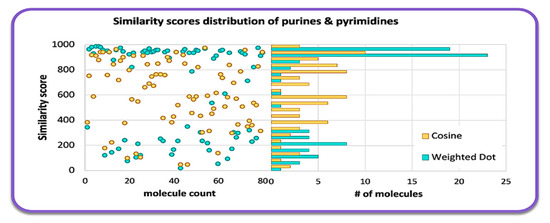 Histogram of MS similarity of QCEIMS predicted versus experimental mass spectra for 80 purines and pyrimidines, comparing weighted dot product and cosine similarity scores.