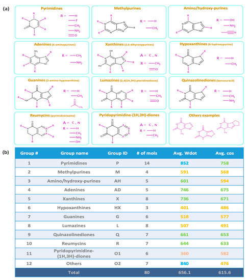 (a) Categorization of 80 purines and pyrimidines by structural subclasses. (b) MS similarity purine and pyrimidine subclasses matching QCEIMS predicted spectra against experimental spectra. Colors indicate excellent matches (>800, blue), good (>600, green), fair (>400, yellow) and poor (<400, red) similarity scores.