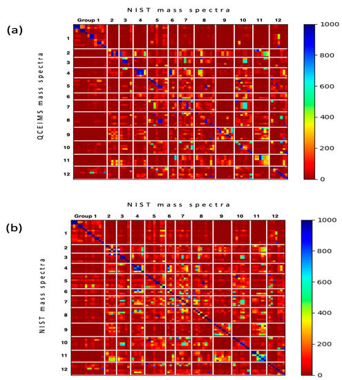 Heatmaps of weighted dot product similarity scored mass spectra sorted by the 12 subclasses of purines and pyrimidines. (a) Matching the 80 QCEIMS predicted versus all experimental mass spectra in the NIST 17 library. (b) Matching the target 80 experimental NIST 17 spectra of purines and pyrimidines versus all experimental mass spectra in the NIST 17 library.