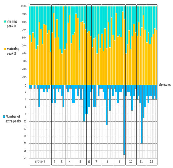 Despite the high variance of MS similarity scores of QCEIMS predicted spectra and outliers, 59 out of 80 molecules were ranked within the top 10 hits and more than half were correct in the top 5 hits when the QCEIMS predicted spectra were used to identify the molecules searching against the NIST 17 library (Table 1). Moreover, 45% of the molecules were correctly identified by matching their calculated spectra to NIST 17 library spectra as the top choice (Table 1). These data confirmed results previously reported for smaller molecules [33]. However, compounds used in our report were larger and more complex. We also showed that the use of QCEIMS predicted spectra for compound identification was directly related to the number of structurally similar molecules in the NIST 17 library. In such cases, we advise using secondary lines of evidence to further rank the most likely structure candidates, such as retention time or biological likelihood [43,44]. Correspondingly, if hits are constrained to very small libraries, false discovery rates may appear very good, while false negative hits would increase. Hence, the discovery of unexpected molecules predicted by methods like QCEIMS would be limited if based on biology- or literature-based constraints. Calculating QCEIMS spectra of novel compounds, possibly even for novel molecular classes, could become feasible in the identification of an unknown compounds in non-targeted analyses.