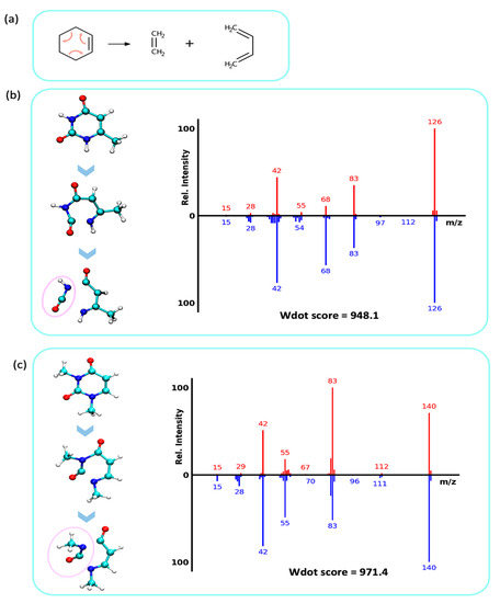 Trajectories from the QCEIMS calculations were investigated via the Visual Molecular Dynamics software (VMD) [50]. Mass spectra were matched to experimental EI spectra by calculating the weighted dot product and cosine similarity scores [15], see Equations (1)–(3):