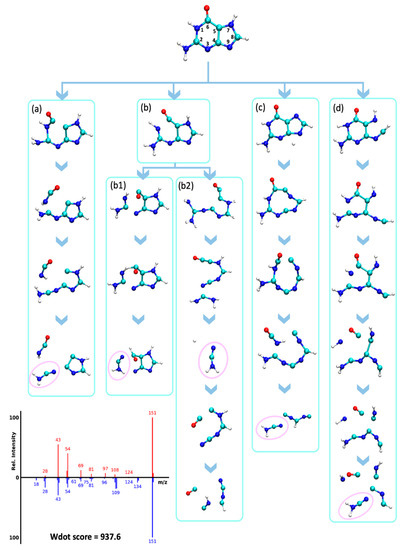 The neutral loss of cyanamide (CN2H2, 42 u) from molecular ions has been observed experimentally in guanines and adenines [42], resulting in fragments m/z 109 for guanine and m/z 123 for methylated guanines. This neutral loss was hypothesized to occur via an rDA reaction [42]. We confirmed this hypothesis via QCEIMS trajectories that correctly predicted the presence of these neutral losses for several guanines (spectra G1-G6, Figure S3), although the abundance of these fragment ions was significantly underestimated. For instance, the guanine QCEIMS prediction yielded seven trajectories that resulted in the loss of CN2H2, corresponding to five different dissociation pathways (Figure 8). Two pathways were observed multiple times in the simulations. The first pathway was the loss of HNCO by cleaving N1-C2 and C5-C6 bonds, which was followed by a N3-C4 bond cleavage that resulted in a CN2H2 loss (Figure 8a–d). The imidazole ring was not affected by this reaction. The pathway in Figure 8b proceeded by breaking N3-C2 and C4-C5 bonds to open both rings. This reaction was followed by cleavages that resulted in either a neutral loss of CN followed by a loss of NCOH (Figure 8(b1)) or a direct neutral loss of NCOH (Figure 8(b2)). Several fragments predicted by QCEIMS were not experimentally observed, for example, m/z 29 for [C=OH]+ in Figure 8(b2,d) possibly because such ions would have too high potential energy. Destabilizing such unreasonable fragments might be a good way to improve QCEIMS in future developments.