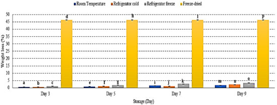The weight loss of watermelon at different storage temperatures during 9 days of storage. Different letters of a, b, c, d, etc. indicate significant differences between samples p < 0.01.