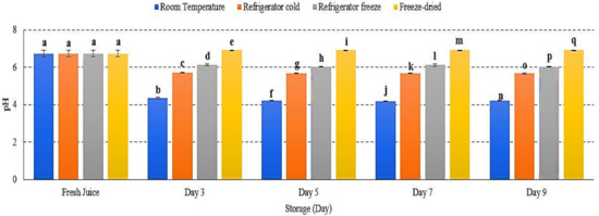 The pH values of watermelon juice during 9 days of storage at different storage temperatures. Different letters indicate significant differences between samples p < 0.01.