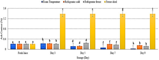 The ash content (%) of watermelon juices during storage at room temperature, refrigerator cold, refrigerator freeze and freeze-dried. Different letters indicate significant differences between samples p < 0.01.