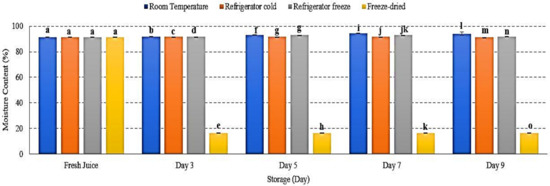 The moisture content of watermelon juice during 9 days of storage. Different letters indicate significant differences between samples p < 0.01.