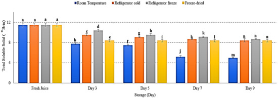 The total soluble solid of watermelon juice during 9 days of storage. Different letters indicate significant differences between samples p < 0.05.