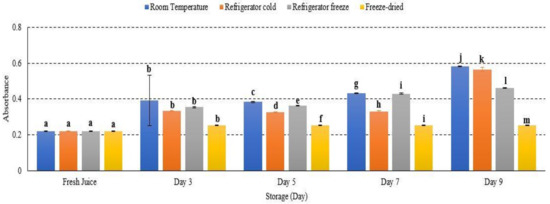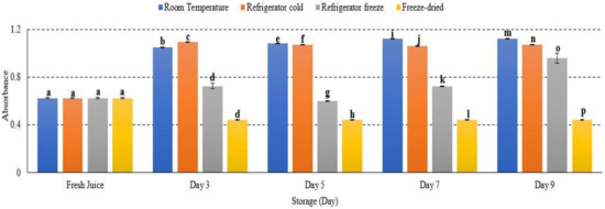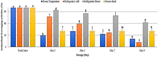 Antioxidant is defined as a substrate resulting in delayed, prevented and removed oxidative damage [58]. Antioxidant scavenging activities in watermelon juice were decreased in all storage temperatures, with significant differences observed at p < 0.05 (Figure 10). After 9 days of storage, refrigerator cold demonstrated the lowest antioxidant scavenging activities followed by room temperature, freeze-dried and refrigerator cold storage (Figure 10). The present results indicated an increased degradation of antioxidant in watermelon juice during storage. The efficacy of antioxidant activities were too dependent on the storage temperature and time exposure. Antioxidant scavenging activities were reported to be more prominent at a higher storage temperature, indicating that antioxidant scavenging activities decreased at higher storage temperature [59]. Moreover, increased storage temperature promoted the degradation of phenolic and flavonoid compounds, leading to ineffectiveness of its antioxidant scavenge properties [60,61]. The study results revealed that the degradation of antioxidant scavenging activities in watermelon juice during 9 days of storage was affected by storage temperature.
