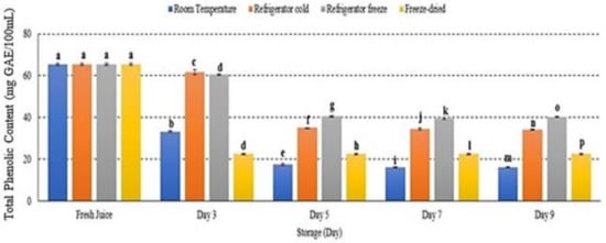 The phenolic compound in watermelon juice decreased at all storage temperatures with significant differences observed p < 0.05 (Figure 8). After 9 days of storage, room temperature displayed the highest phenolic degradation among other storage conditions (Figure 8). The present study demonstrated that refrigerator freeze was able to retain phenolic degradation under 9 days of storage period. The study attributed that phenolic degradation was affected by storage temperature, particularly increased storage temperature, and subsequently promoted phenolic degradation [48,49]. Hence, this supported that TPC is temperature-dependent [48].