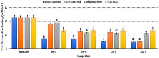Flavonoids are plant secondary metabolites, which belong to phenolic groups [52]. Interestingly, flavonoids also act as antioxidants in scavenging free radical and reactive oxygen species [53]. The present study showed decreased flavonoid content in watermelon juice stored at all storage temperatures p < 0.05 (Figure 9). After 9 days of storage, room temperature and refrigerator cold showed the lowest flavonoid content, followed by refrigerator freeze and freeze-dried storage (Figure 9). Although TFC level in both refrigerator cold and room temperature storages displayed 11 mg/Qu on day 9, the degradation trend of flavonoid compound in refrigerator cold storage was slower compared to room temperature (Figure 9). Phytochemical phenolic and flavonoid compounds are temperature-sensitive and easily deteriorate under various conditions of temperature, light, pH, and oxygen, resulting in loss of its antioxidant and bioavailability activities [54,55]. The results indicated that cold storage temperature retained flavonoid stability [29]. An increased storage temperature was able to promote flavonoid degradation [49] and resulted in alteration of phenylalanine, hence reduced flavonoid content [56]. The present study supported that exposure towards higher temperature altered flavonoid structures, subsequently inducing degradation [29]. Furthermore, the study demonstrated an increased flavonoid in freeze-dried watermelon juice on day 7 and day 9 of storage with decreased phenolic content possibly due to poor selectivity of the Folin Ciocalteu method to quantify total phenolic in the sample extract [57]. Hence, this study presented the loss of TFC in watermelon juice during storage due to alteration of flavonoid structures at storage temperature.